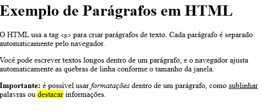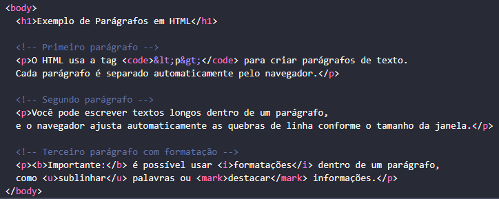 Parágrafos em HTML são criados com a tag <p>, que delimita blocos de texto separados. Eles organizam o conteúdo em partes legíveis e estruturadas.