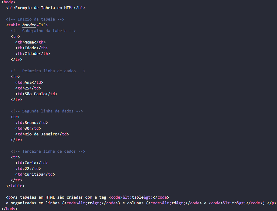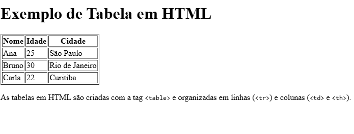 Tabelas em HTML são criadas com a tag <table>, organizando dados em linhas (<tr>) e colunas (<td>). Cabeçalhos são definidos com <th> para destacar títulos.