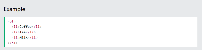 Uma lista ordenada começa com a <ol>tag. Cada item da lista começa com a <li>tag.