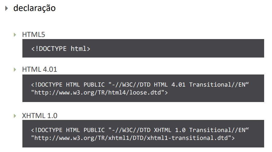 Todos os documentos HTML devem começar com uma declaração . A partir da versão 5 o HTML deixou de ser baseado em SGML (Standard Generalized Markup Language), e com isso a forma de declarar o DOCTYPE foi simplificada.